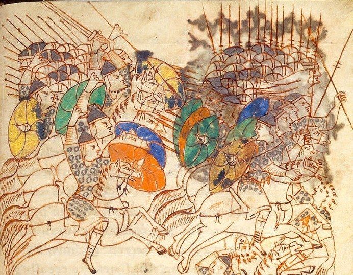 Origin and history of conservation This Codex, now in the Leiden Library in the Netherlands, is dated to the first half of the 10th century. It is therefore straddling between the extreme end of the Carolingian era, and the beginning of the Ottonian era. The construction of this work probably began at the Abbey of St. Gall, but seems to have been finalized at Reichenau Abbey in Germany. The manuscript contains the first book of "Maccabees" and the copy of the fourth book of "Epitoma Rei Militaris" of Vegetius. They were both assembled at the very end of the 12th century. Unfortunately, there is no digitization of the document in its entirety, and we will only be able to study scattered folios available on the Internet. Description of the content This Codex is famous for its formidable representations of bellicose scenes. The figurative events are biblical, but it seems that the, or the draftsmen, were inspired by Magyares incursions that ravaged southern Germany in the tenth century. Once again, and as is customary in Carolingian religious literature, contemporary material elements of the writing of the document are set on a narrative narrative relating older events. The stylistics of the drawing is particular, since it plays on the effects of compact accumulations of characters, preventing in fact any quantitative analysis where the basic unit is the individual. However, it is possible to identify with relative ease the represented militaria and to make cross-checks with available textual and archaeological data. The drawing of a rare delicacy offers valuable information on late Carolingian military equipment, and that of the Magyars, both mixed in scenes where soldiers are regularly arranged in combat formation. Analysis of military equipment Most warriors wear heavy chainmail, which is not usual in Carolingian iconography where scaled armor predominates. Perhaps it is due to the late nature of this document. Note, however, that some characters are protected from scalar armor already frequently encountered in the Stuttgart Psalter, written a hundred years earlier. The question of helmets, is quite difficult: About half of the helmets represented is similar in all respects to the helmets usually represented in Carolingian illuminations. They are reinforced with two crosspieces on the summit part, as well as another on the whole circumference: it is thus of "spangenhelms" all that is more classic. But the other half of the helmets has a tapered shape on the top and look in all respects to the helmet Pecs (Hungarian people, current Hungary, tenth century). It is possible to observe on the neck of the soldiers what could be a cover of chainmail or thick fabric, that Carolingians named "hasberga". Let us note that it is more prudent to abandon any hope of discovering in the Carolingian iconography any copy of a nasal helmet: Some reenactors rely on one or two helmets that have fallen to the ground, and believe that they see a nasal that is probably only a schematic representation of the chin strap, or the cover from the back of the helmet that fell to the ground. The shape of shields and umbos is quite classic. Note however the regular presence of oval-shaped shields without umbos, possibly of exogenous origin? For the rest, spears, javelins and swords are clearly visible, but the drawing does not allow to identify the typology accurately. We can also distinguish another element of more specific militaria, regularly represented in Carolingian iconography: the arc (composite, and of exogenous origin) with double curvature. Battle tactics Precious representations of phalanxes in compact formation can be seen in the Book of Maccabees. These men of humble condition are rarely represented in detail and deserve our full attention since they represented the backbone of the Carolingian and Ottonian army. These phalanges consist of soldiers grouped in tight formation, armed with a spear of medium length and protected from a shield. We will devote a whole article later to the operation of these phalanges, so much is it complex. At the option of the folios, riders ride in formation towards the opponent, ready to inflict violent blows with the help of the central umbo or the slice of the shield. The fugitives, also on horseback, wear their shields in the back with a strap to better protect themselves from projectiles. These scenes, of great wealth are witnesses of a tactic particularly appreciated by the Carolingian cavalry: the feigned retreat. Nithard, Charlemag's grandson , Count of Ponthieu and often struggling with the Scandinavians, went so far as to describe with precision this stratagem in his chronicles "Historia". This tactic is to charge the opponent, then, a few seconds before the shock, to simulate a retreat. The enemy, sure of his victory, may then start a disorganized pursuit. The attackers, on the run, of course, but still in formation, turn around and can surprise their pursuers whose ranks have been broken. In this tactic, training cohesion matters more than the load speed itself. The disaster of the Battle of Mount Süntal is the perfect illustration: the heavy free riders have loaded the Saxon forces at full speed without remaining in compact rows and suffered a terrible military failure, forgotten (voluntarily?) Carolingian literature , with the exception of the Annales regni Francorum of the year 782. Conclusion The Book of "Maccabees" is a source of great importance. Indeed, this Codex presents a military material, worn in real conditions (ie on a battlefield) as is rarely the case in Carolingian iconography. Therefore, it is possible to imagine more easily the use of the weapons and armor represented and the tactics employed on foot as on horseback. Finally, the drawing seems devoid of ancient influences, which frees us from the traditional questions relating to the origin of the represented militaria. Bibliography: Bachrach B. (2001) Early Carolingian Warfare Coupland S. (1990)