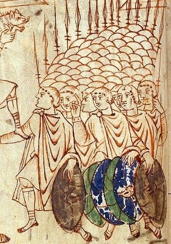 De précieuses représentations de phalangistes en formation compacte sont visibles au sein du Livre des Maccabées. Ces hommes d'humble condition ne sont que rarement représentés en détail et méritent pourtant toute notre attention puisqu'ils représentaient l'épine dorsale de l'armée carolingienne, et ottonienne. Ces phalanges sont constituées de soldats groupés en formation serrée, armés d'une lance de longueur moyenne et protégés d'un bouclier. Nous consacrerons ultérieurement un article entier au fonctionnement de ces phalanges, tant il est complexe.