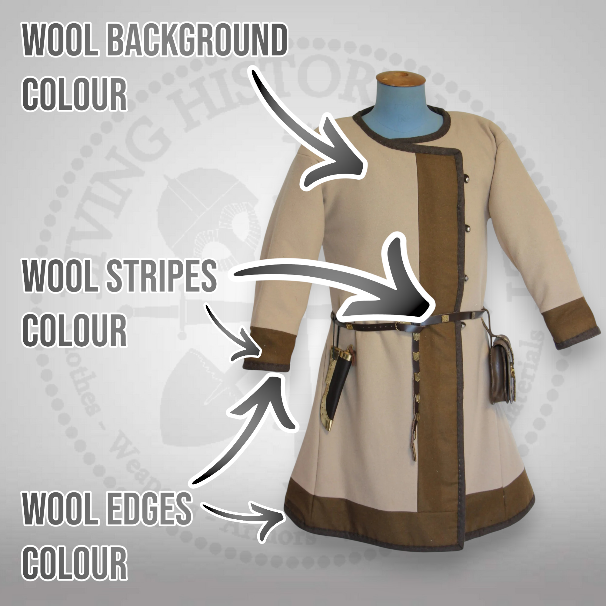 Outer layer: woolen fabric.Invisible padding, made of 3 layers of felt (1.5 to 2 cm thick) on the shoulders, upper torso and upper arms - where the hits hit the most. A layer of felt covers the rest of the body.