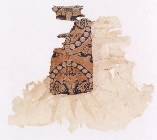 Sui dynasty brocade decorated with twin peacocks and two peacock motifs with the character "贵" (noble/precious), preserved in the Xinjiang Uyghur Autonomous Region Museum.